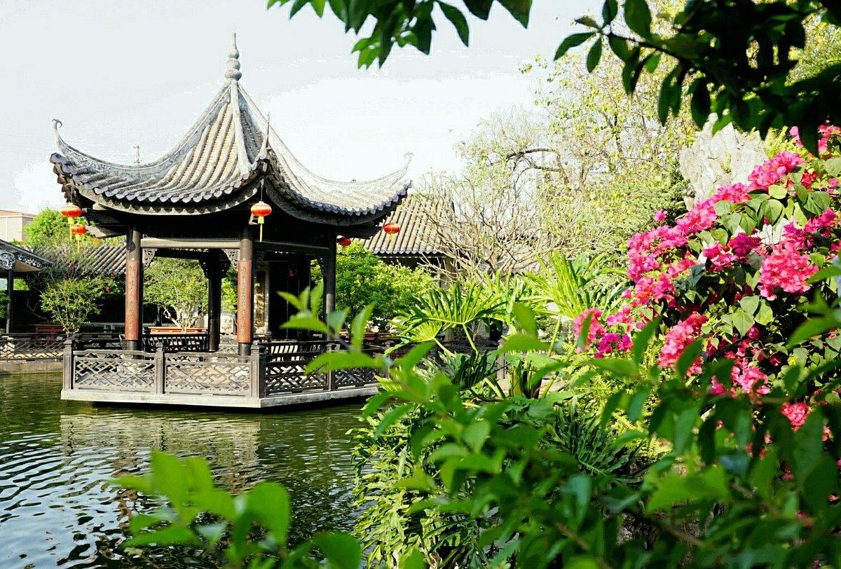 Giữa những khóm hoa có lối đi và ghế nghỉ.