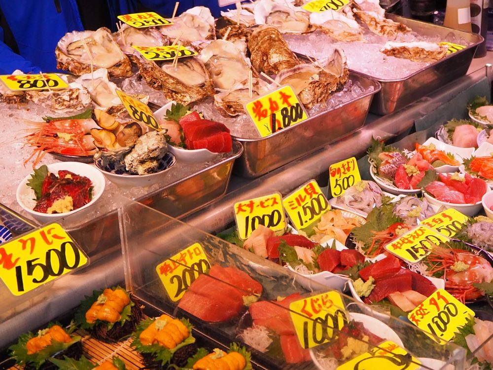 Một điểm thú vị nữa là bạn có thể vừa đi bộ vừa thưởng thức nhiều loại đồ ăn phong phú từ tôm nướng muối, hào sống, Katsu Sando, Onigiri, xiên que nướng… Cũng có nhiều quán chuyên bán trứng chiên nên những người không ăn được các loại cá có thể yên tâm.